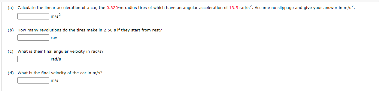 A Calculate the linear acceleration of a car the 0320-m radius tires of which have an angular acceleration of 135 rads2. Now the formula for linear acceleration is given by. α 15 rads².
